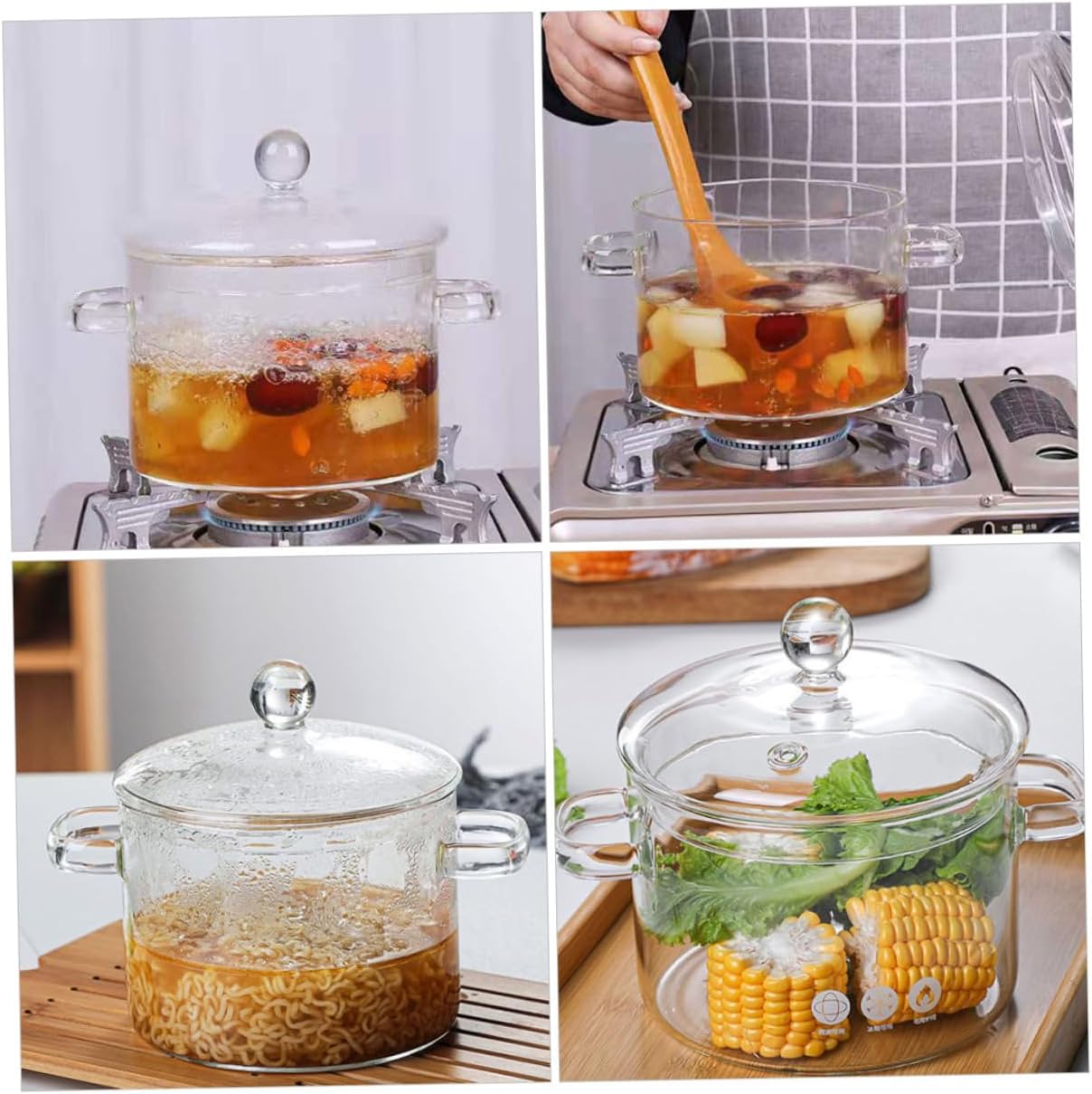 Package Include 2 x with lid Features - Size: 15.00X15.00X10.50cm/5.89X5.89X4.13in glass cooking pot -Material:High borosilicate glass kitchen cooking pot -Capacity:1500ml glass saucepan with lid -Color:Transparent kitchen cookware - Made using High Borosilicate Heat-resistant Glass, can withstand sudden heat and sudden cold kitchenware. - texture, details, which can bring you a experience. Fast heat conduction and slow heat dissipation, reducing the loss of heat glass saucepan. - The handle for easier and more convenient to move. The design is smooth and does not hurt the hand for using and cooking stew pot. - Bottom energy gathering heating, energy saving and , save gas cooking pot with lid. - Under high temperature, it will not soften and deform. Stable material, , easy to clean kitchen noodle pot.Goods Informationhousehold stew pot It can withstand high temperatures, which can be used for a long time.cooking pot It has smooth surface for easier to clean and wash.glass saucepan want to have a multi-functional pot? If so, our glass stew pot is carefully prepared for you.cooking pot with lid It can be used to stew soup, cook braised chicken, porridge, and so on