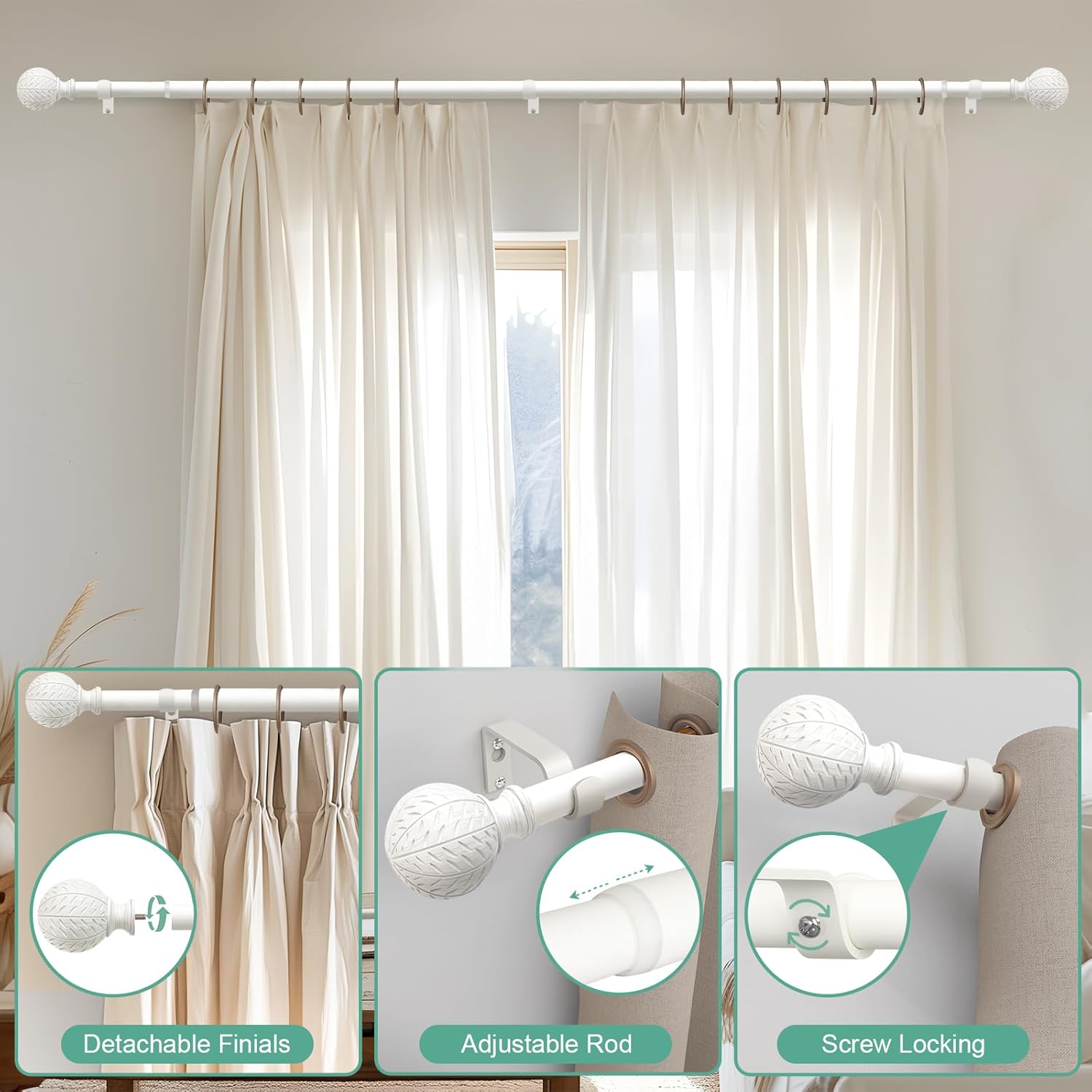 Antique White curtain rods with leaf pattern finials